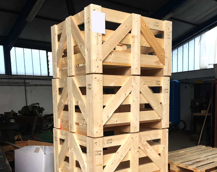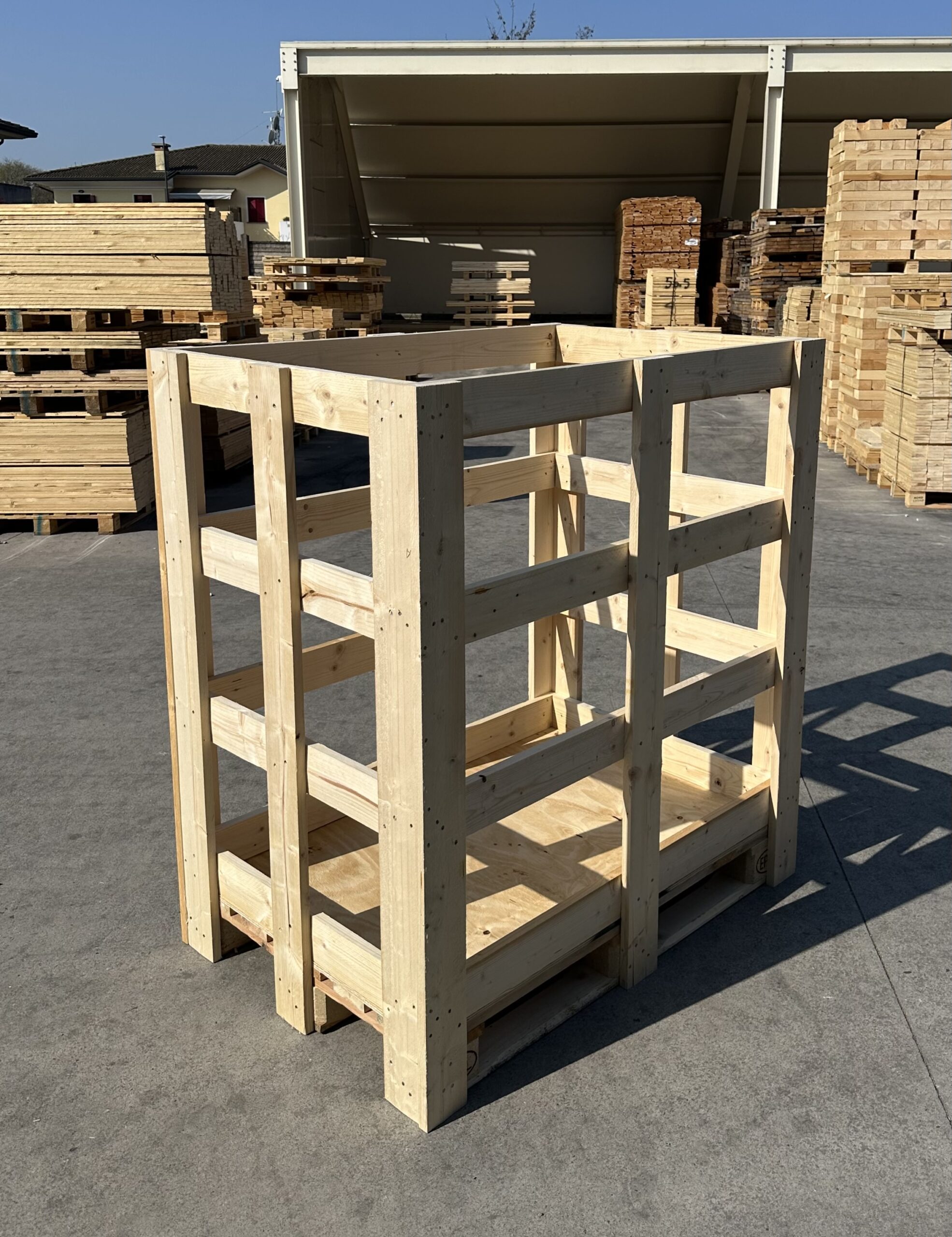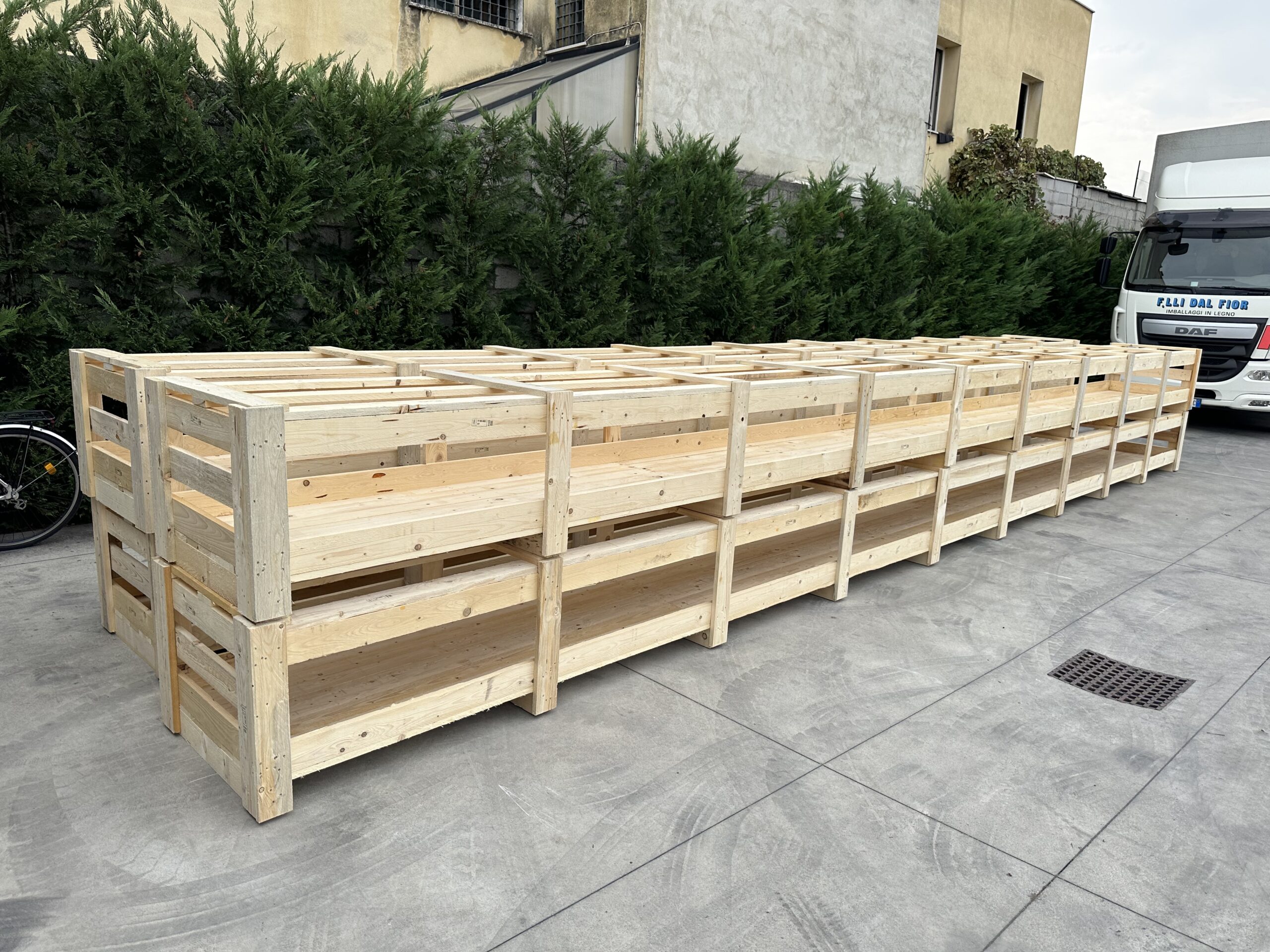 Le gabbie vengono costruite sempre su misura e con tavole in abete alternate, con spaziature in base alle esigenze del contenuto. Possono essere marchiate FITOK e costruite in vari formati e dimensioni.